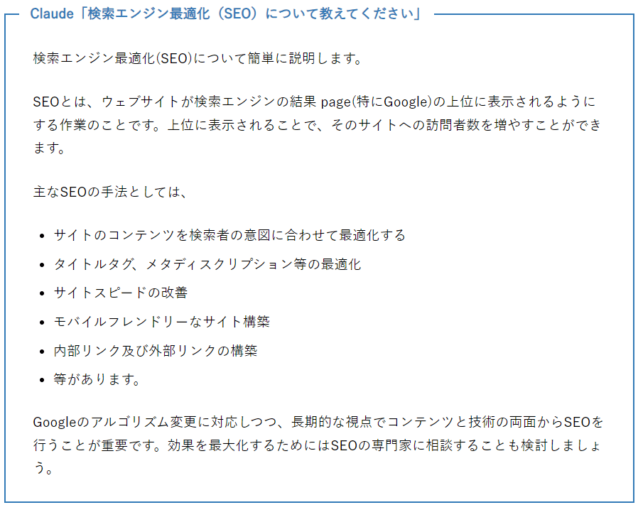 - プロンプトは「検索エンジン最適化(SEO)について教えてください」のみ