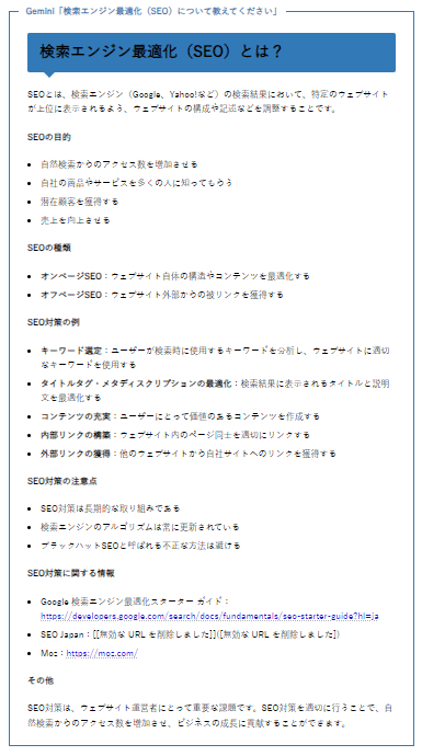 今回のプロンプトには「検索エンジン最適化(SEO)について教えてください」を使用しました。このため、Googleが運営するGeminiに有利な点はあります。皆さんもご自身の専門分野で、執筆能力を比較してみてください。