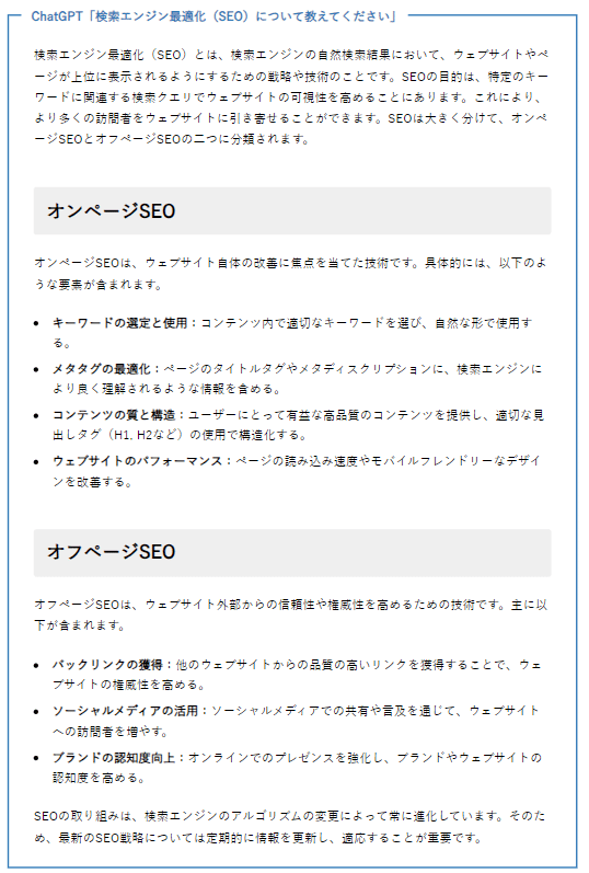 なお、ChatGPTは英語で生成した文章を日本語に翻訳しています。このため、日本では馴染みのない言葉「オンページSEO」や「オフページSEO」が使用されています。