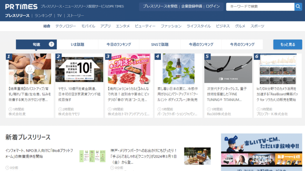 PR TIMESは、一定の審査を通過した会社設立2年以内の会社に限り無料での利用が可能なプレスリリース配信サービスです。