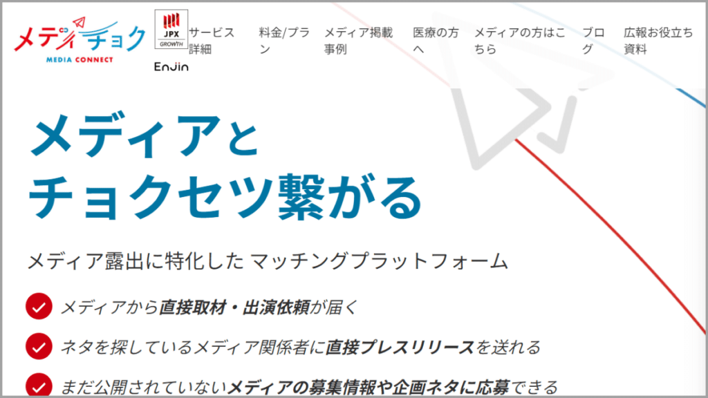 メディチョクは、大手メディアとの直接のやりとりが可能なプレスリリース配信サービスです。