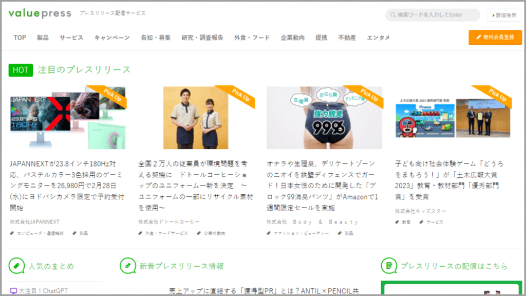 valuepressは7万社以上の使用実績があるプレスリリース配信サービスです。機能制限があり1回のみですが、無料でのリリース配信が可能です。